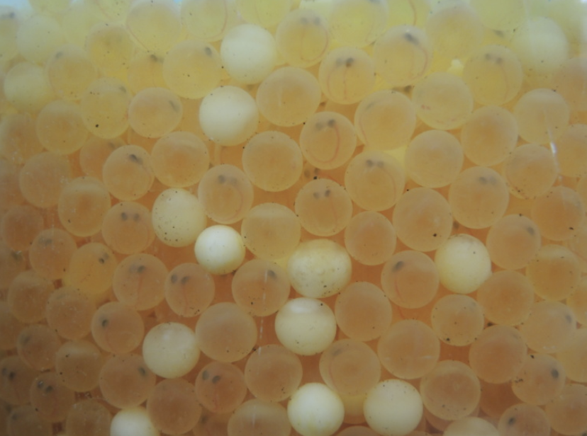 Almost certainly some of the eggs you’ve received will die. In contrast to healthy, viable eggs which are translucent and orange, the dead and dying eggs turn white, as in this photo.