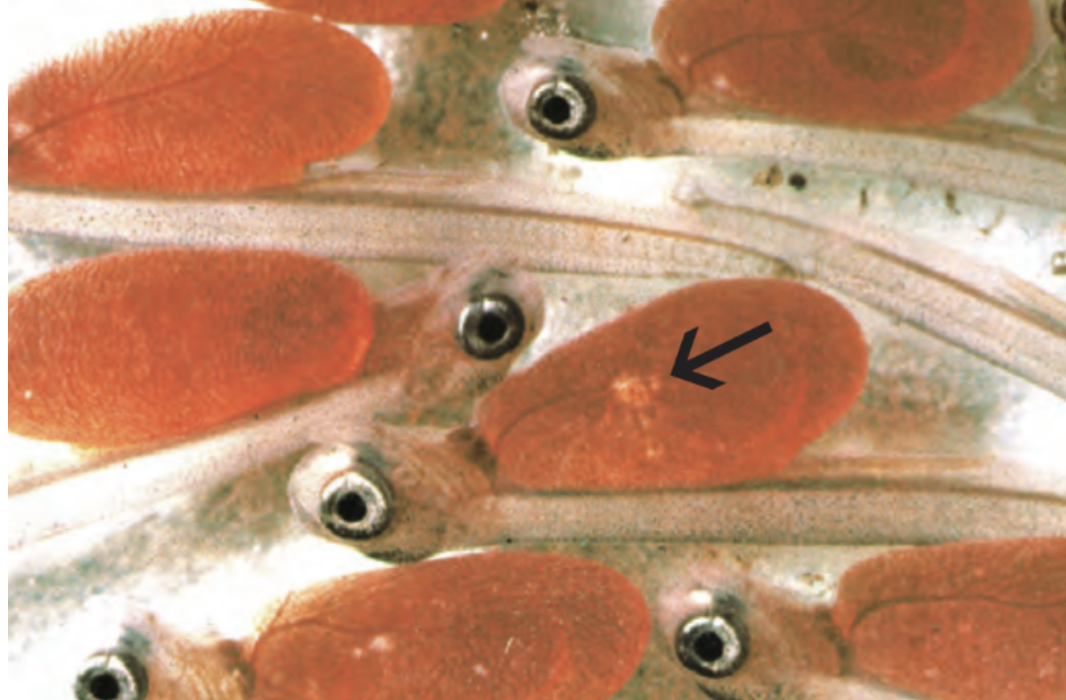 In the past there have been a few reports of coagulated yolk disease. Coagulated yolk disease presents as a white spot in the egg or yolk sac of alevin. If you have fish die from any type of disease, whether it is contagious or not, be sure to remove them from the tank so as not to spread the fungus.