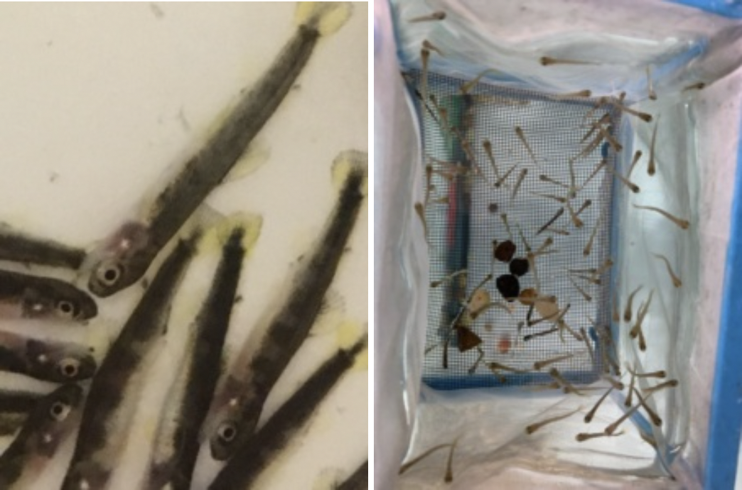 If, for whatever reason, you miss the critical window of Swim-up, you will not get a second chance and your alevin will likely become “pinheads.” Pinheads are fish that never learn to eat and instead get skinnier and skinnier until they die. Below is a close-up of some pinheads (L) and a feeder basket that has a mix of pinheads and alevin that successfully completed swim-up and are starting to feed (R). |